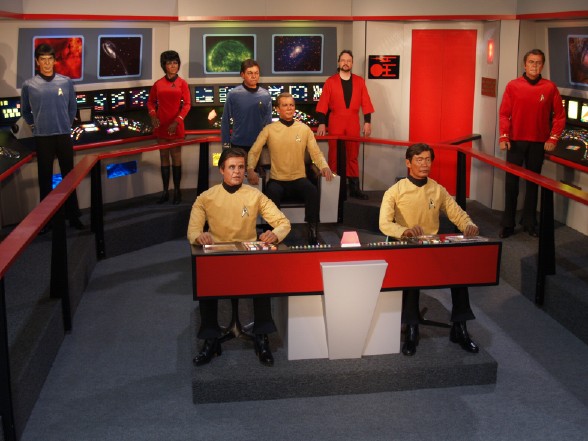 Below: Thomas on the bridge of the Enterprise, at Worldcon in 2006. The rest of the crew are waxworks. |