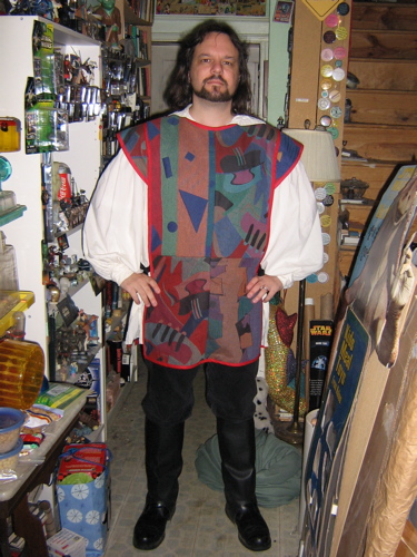 This fancy tabard was made from 27-inch square swatches of upholstery fabric inherited from Thomas' aunt Alice. Thomas made it primarily to wear to work selling puzzles at the Maryland Renaissance Festival, but of course it's been shown off elsewhere.