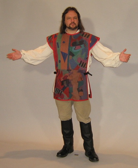 This fancy tabard was made from 27-inch square swatches of upholstery fabric inherited from Thomas' aunt Alice. Thomas made it primarily to wear to work selling puzzles at the Maryland Renaissance Festival, but of course it's been shown off elsewhere.
