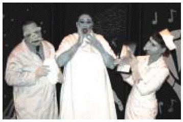Additional InformationThis presentation, a tribute to The Twilight Zone, won "Best in Show" at the 2001 Worldcon Masquerade in Philadelphia. The costumes, all done in black-and-white (including makeup). were presented to the Manhattan Transfer's song "The Twilight Tone." Our twelve-member group portrayed Rod Serling and six separate vignettes paying homage to six Twilight Zone episodes: "To Serve Man," "The Invaders," "Beauty is in the Eye of the Beholder," "It's a Good Life," "Living Doll," and "Time Enough At Last." The presentation ran a crisp 120 seconds, with an additional 30 seconds of exit music. We had rehearsed for two months beforehand, and the result was amazing. The crowd absolutely went wild -- clapping along with the music, cheering and applauding madly -- when we took the stage to receive our award, we received a standing ovation. "Fridays at Ten" was presented and created by Amanda Allen, Michael Atkinson, Thomas Atkinson, Dan Corcoran, Deborah Feaster, Jeannette Holloman, Sharon Landrum, Ric Rader, Ron Robinson, Don Sakers, Ann Stephens, and June Swords. |