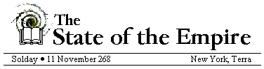 The State of the Empire Report, produced under the aegis of the Grand Library, was the daily newspaper of the First Terran Empire. Ostensibly for the members of the Imperial Council (and later, the Emperor), The State of the Empire Report was available to all citizens; it was distributed widely and read by nearly everyone.