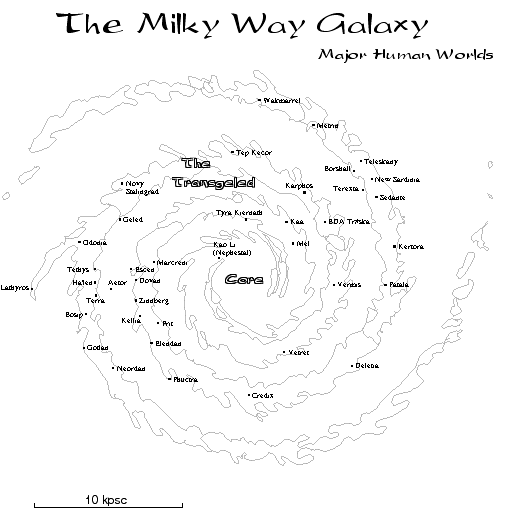 In TE 70 (2223 CE), under the auspices of Imperial Centcom, six Ultrawave Relay Stations were deployed in a great equilateral triangle around the Galaxy. Relays Alpha, Gamma, and Epsilon were set at 1/3 of a Galactic diameter; Beta, Delta, and Zeta were at 2/3. Alpha was placed on a line directly connecting Terra to the Galactic Core. (map)